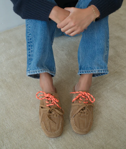 Suede mule with moccasin-style stitching, sporty lace-up detail, and open back. A laid-back hybrid silhouette blending slipper comfort with sneaker edge.